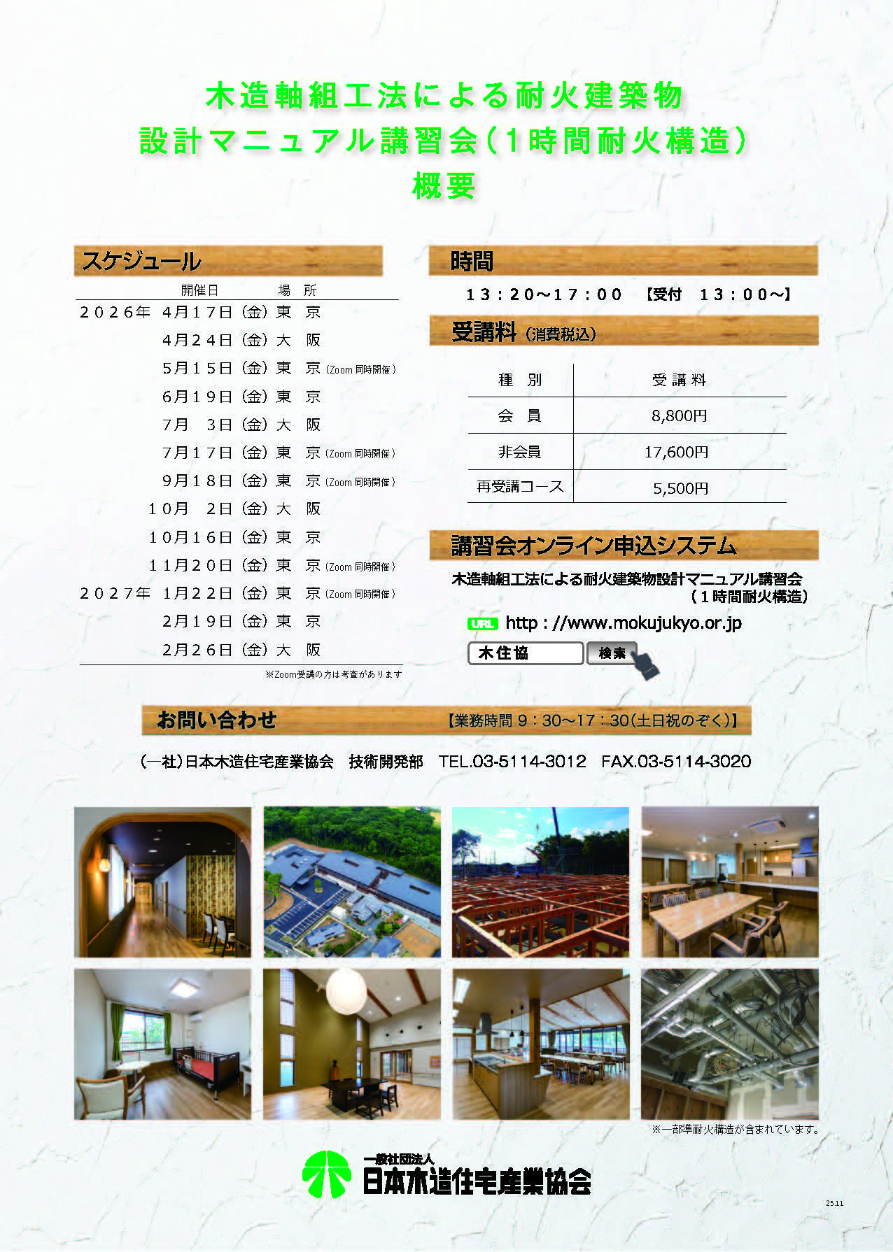| 2026年04月17日 | 東京 | (一社)日本木造住宅産業協会 6階 会議室 東京都港区六本木1-7-27 全特六本木ビル WEST棟 6階 |