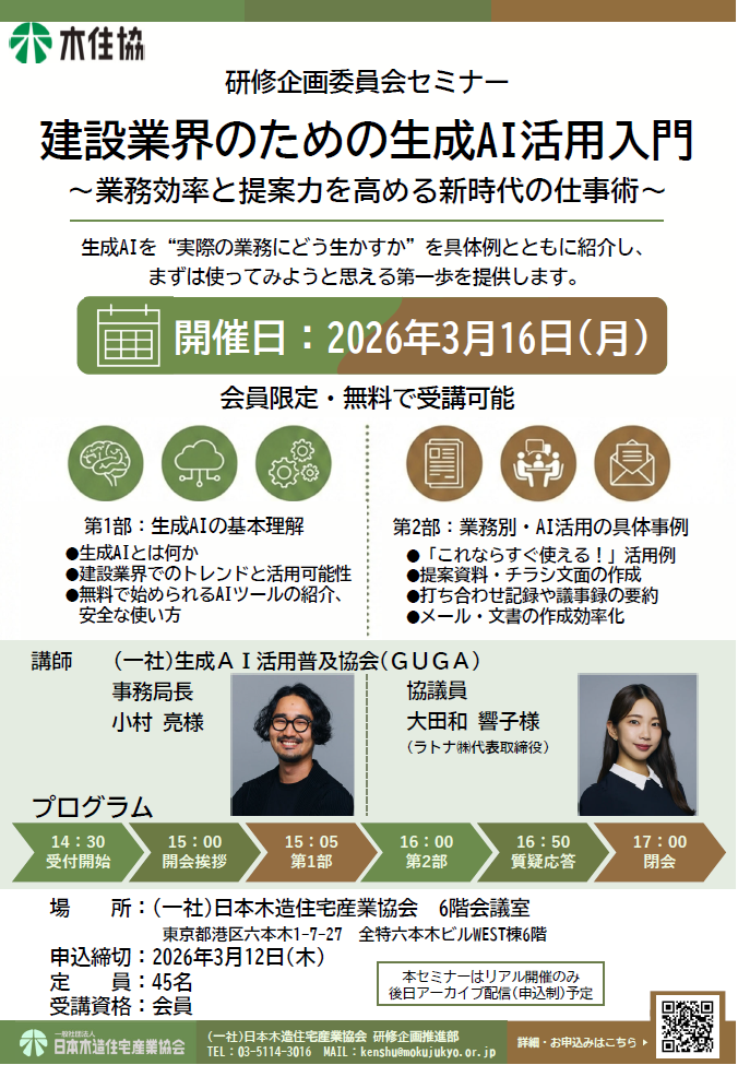 『建設業界のための生成AI活用入門~業務効率と提案力を高める新時代の仕事術~』についてご講演いただきます。