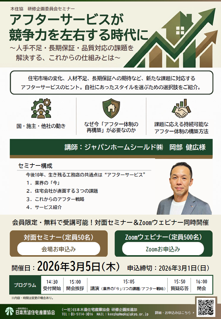| 2026年03月05日 | 東京 | (一社)日本木造住宅産業協会 6F会議室 東京都港区六本木1-7-27 全特六本木ビル WEST棟6階 |